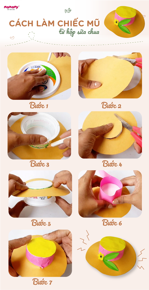 Những chiếc mũ bé xinh sẽ là vật dụng cần thiết luôn đồng hành cùng bé ở những hoạt động vui chơi ngoài trời. Góc của mẹ sẽ gợi ý cho mẹ và bé cách làm chiếc mũ đội đầu bằng hộp sữa chua siêu dễ nhé