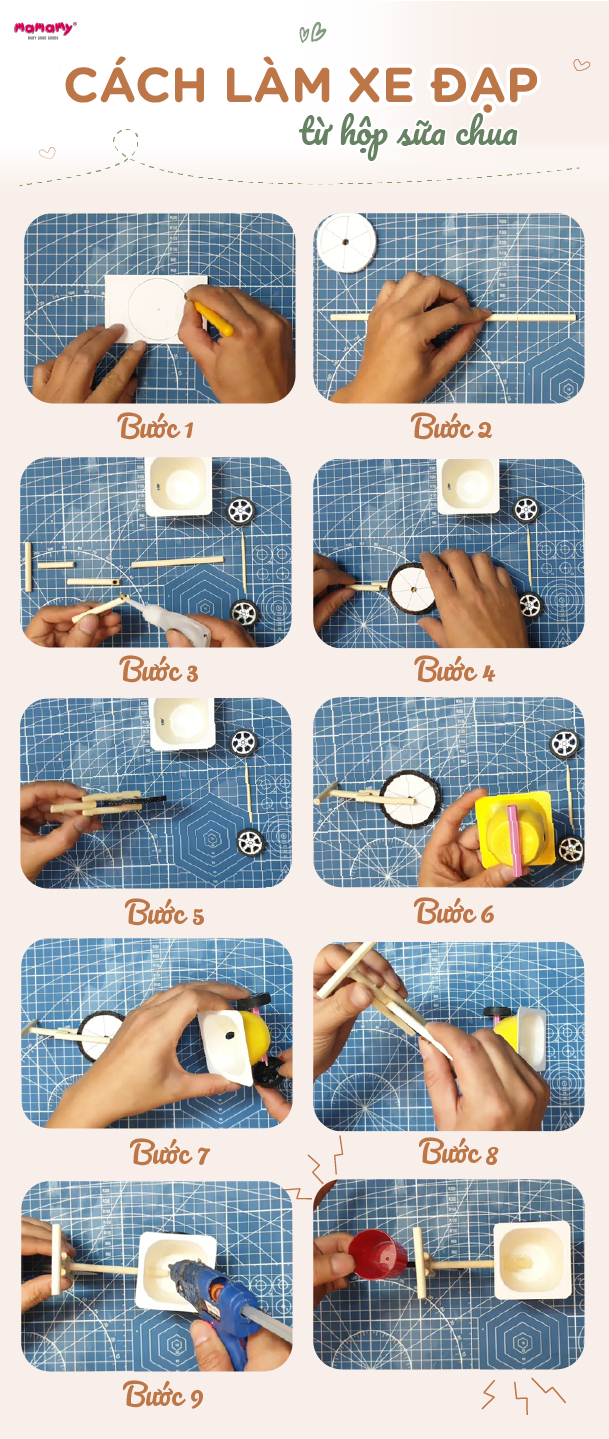 Một gợi ý từ Góc của mẹ về các mẹo làm đồ chơi bằng hộp sữa chua là cách làm xe đạp nhỏ xinh, tiết kiệm mà mẹ nên tham khảo