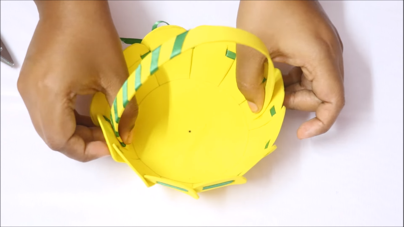 • Bước 3: Luồn dây ruy băng qua các điểm vừa cắt trên cánh hoa. Kéo sát dây lại để tạo thành hình giỏ hoa mẹ nhé.